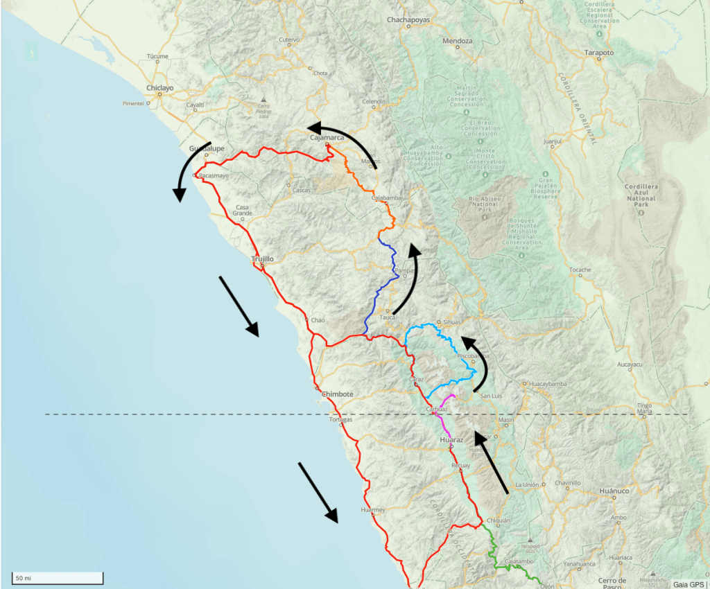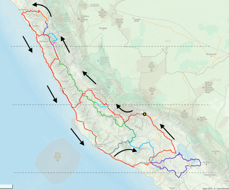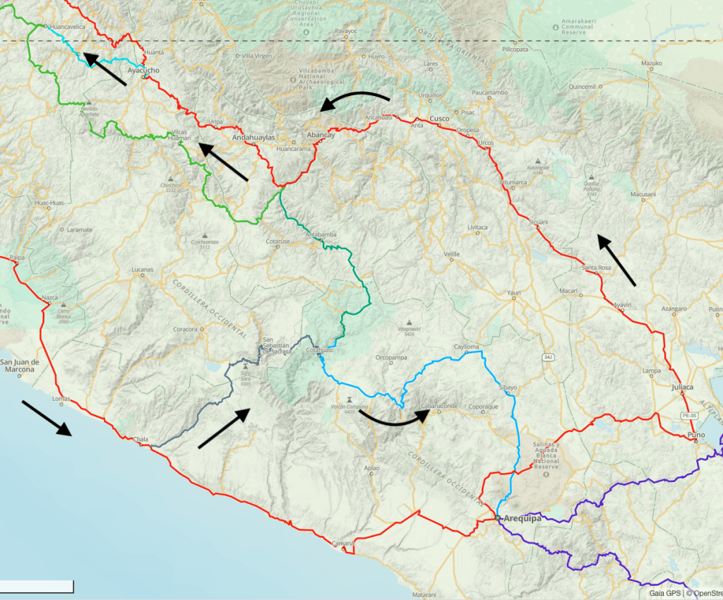 The precise route will be determined as we make our way, but generally speaking, the plan is to make our way north from Cusco through the Andes; return south along the coast; then south and east into the mountains and back to Cusco. Along the way we expect to stay in hotels/hostels much of the time, but we will camp out as frequently as circumstances will allow.