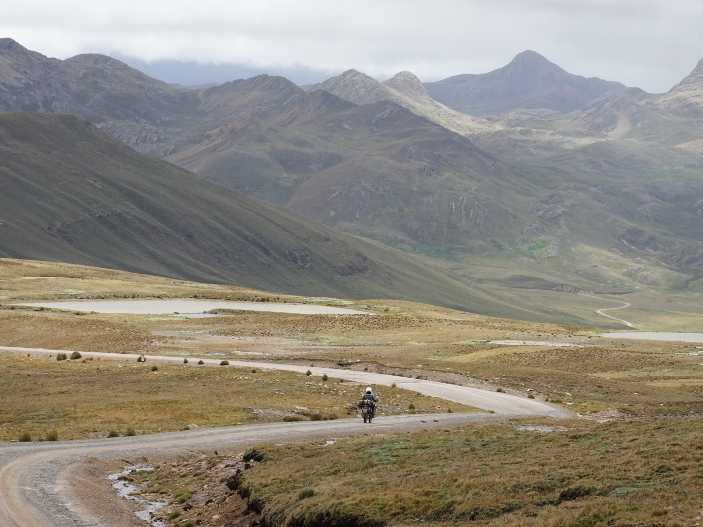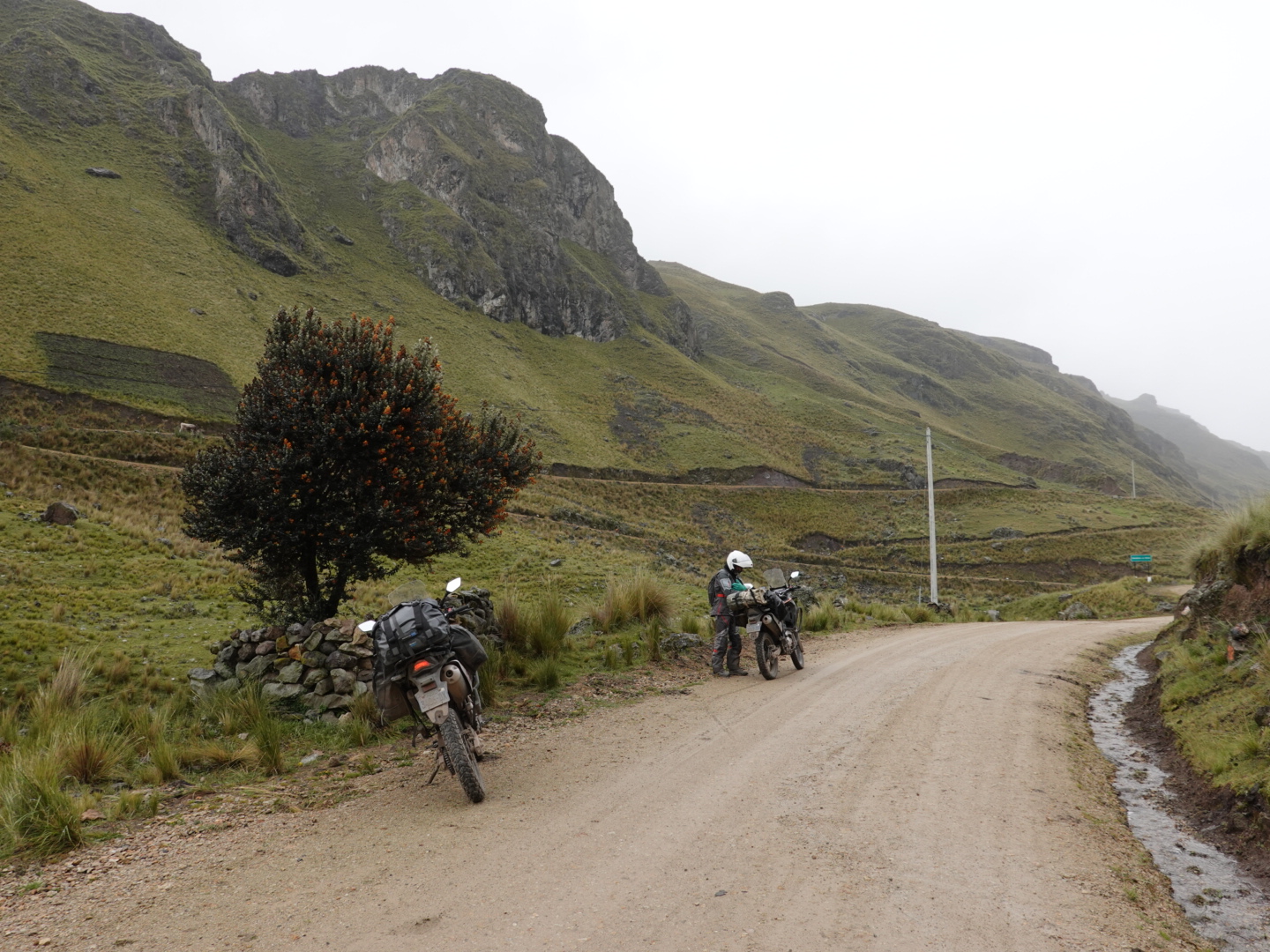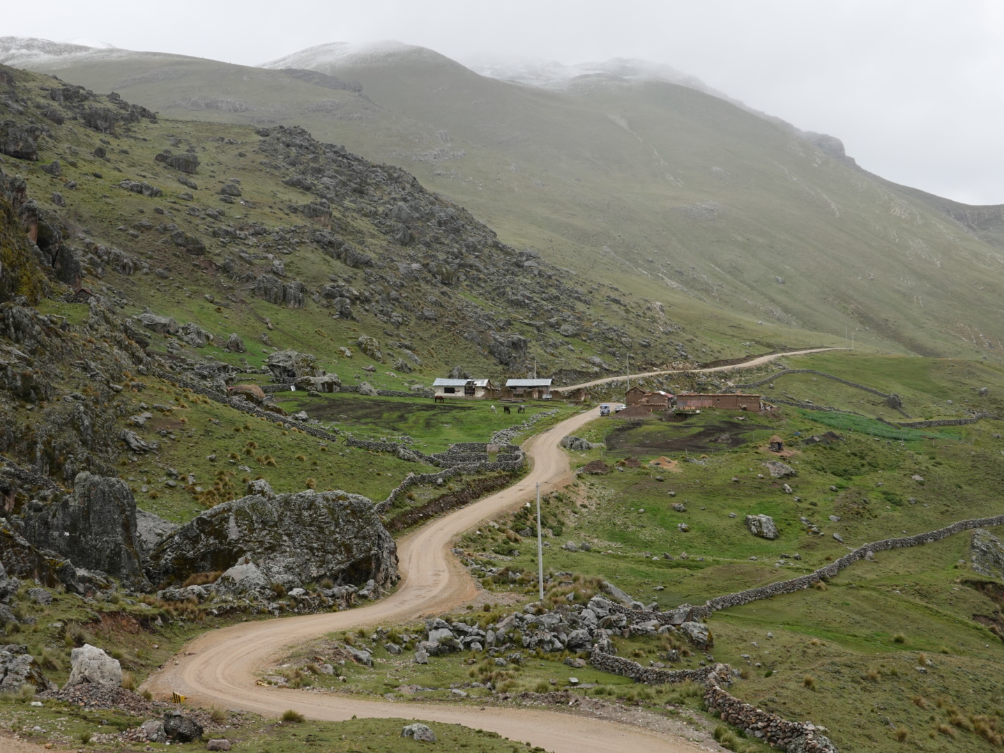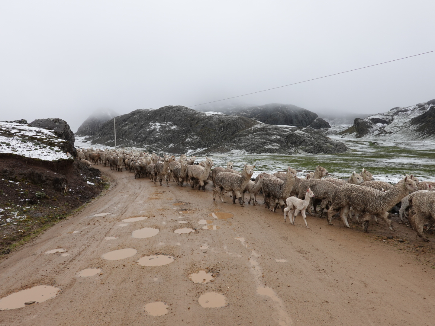 In any case, our plan today was to pick up one of these routes and head north. As seems to be typical to the start of all our days in Peru, we pretty immediately started climbing. This time from 12,400 feet up to over 15,000 feet. As we climbed we found ourselves in a light, but steady rain and, of course as we got higher it got colder. Once we peaked we rode for 30 minutes or so at that level before dropping again. As you’ll see from the photo’s, the landscape was covered with a light coating of snow, which accentuated the scenery. In the ensuing 2 hours we dropped to 12,000 feet and climbed back up to 15,000+ feet twice in succession through a series of rain showers.