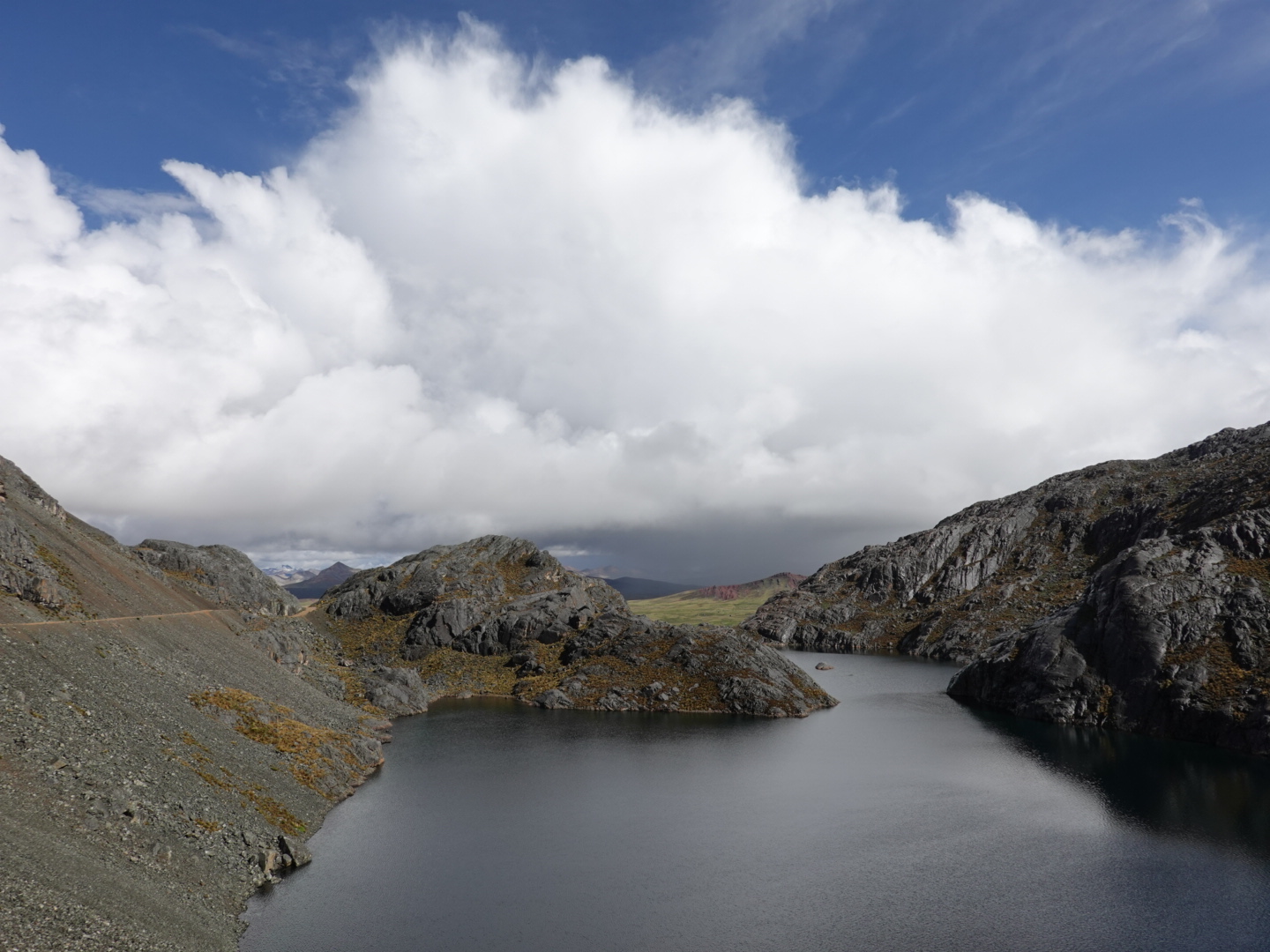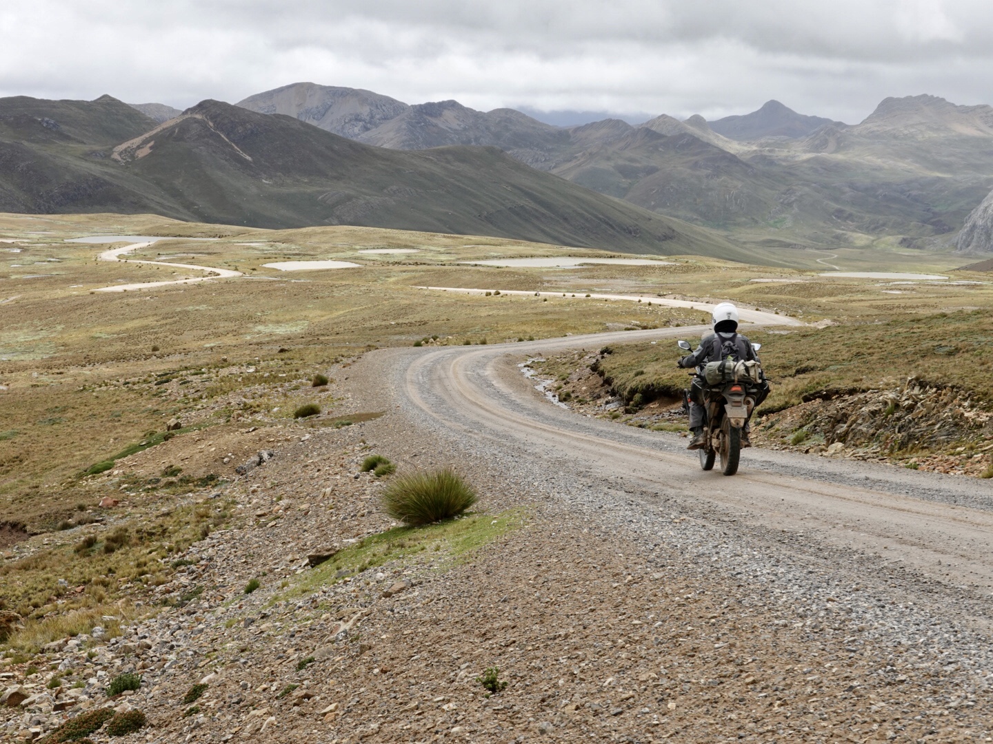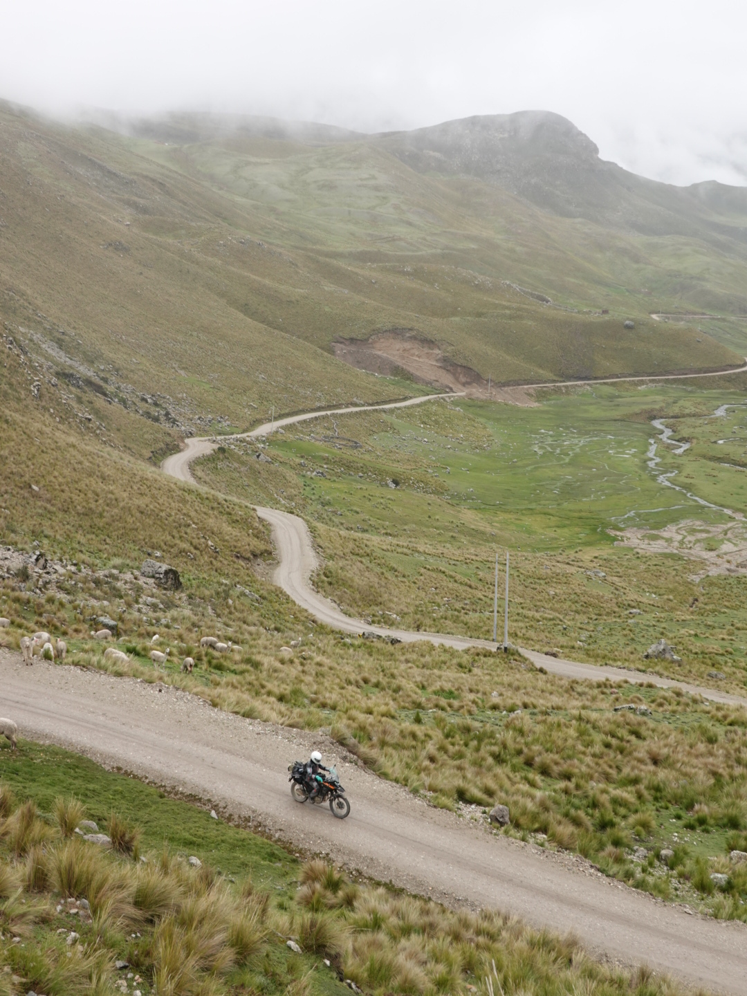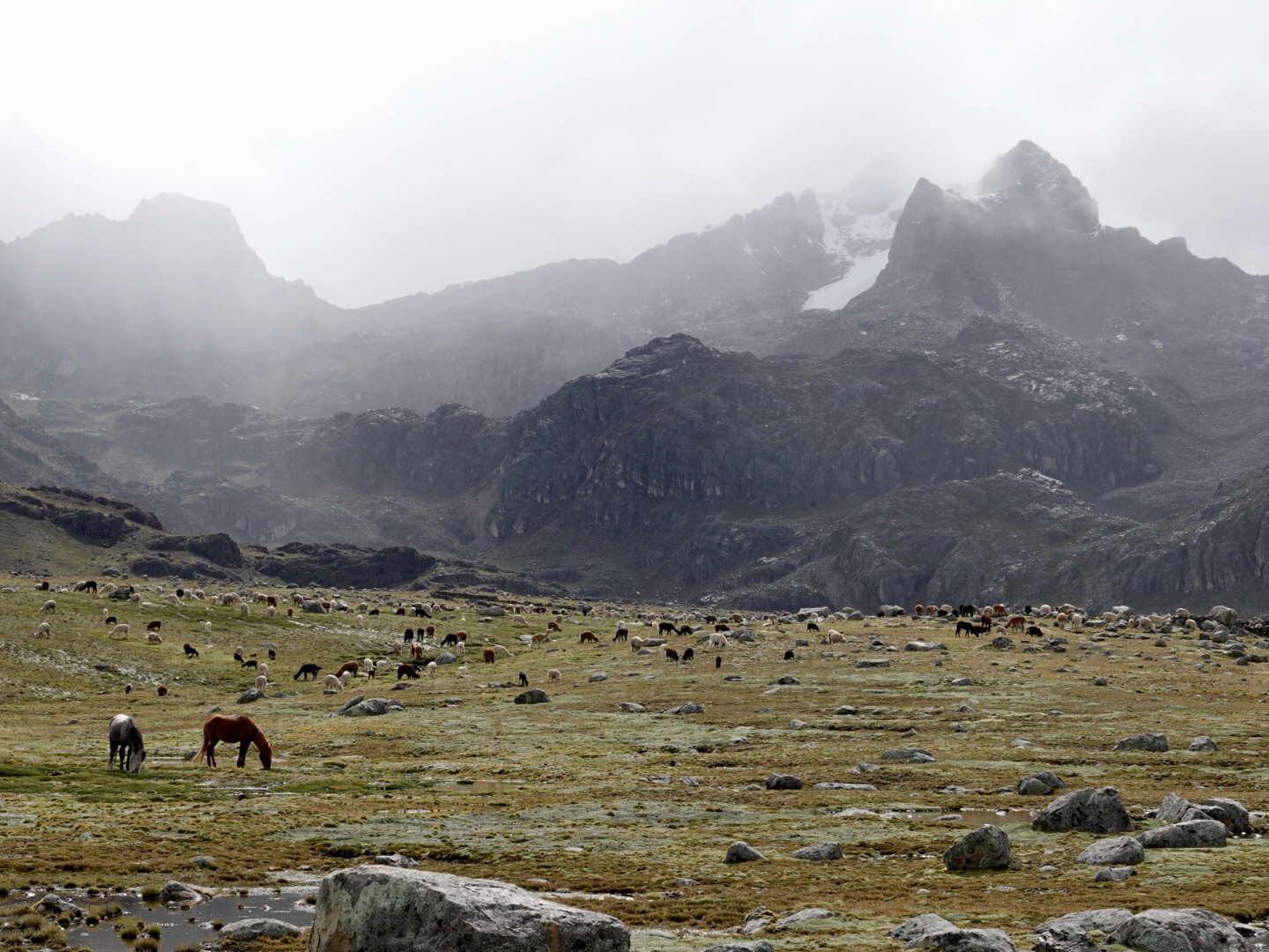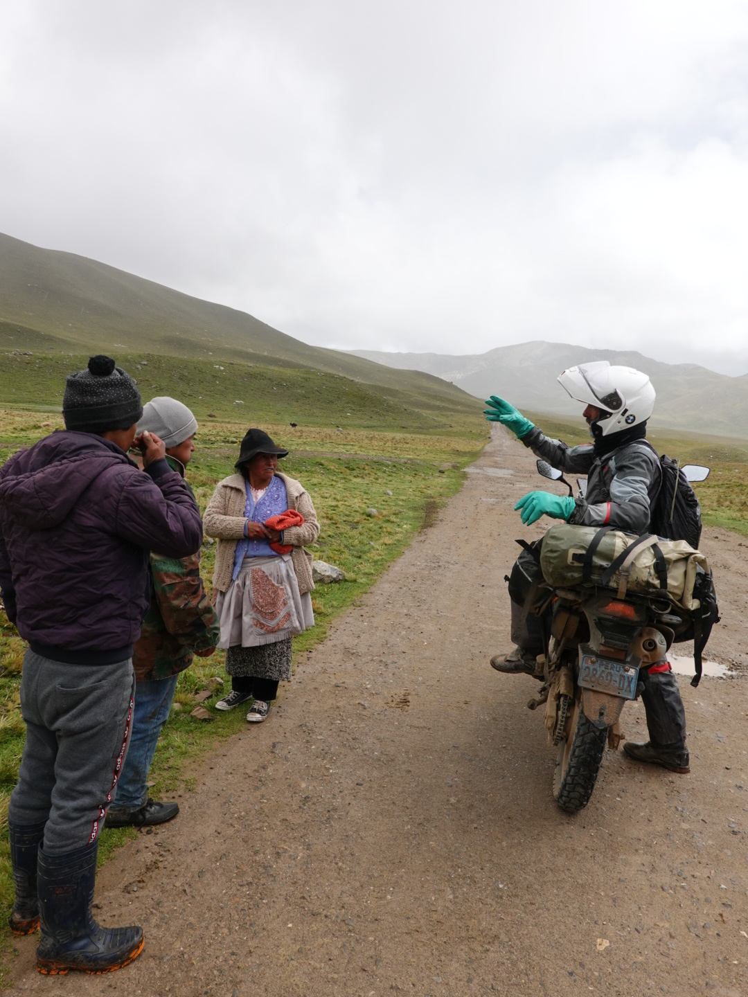 In any case, our plan today was to pick up one of these routes and head north. As seems to be typical to the start of all our days in Peru, we pretty immediately started climbing. This time from 12,400 feet up to over 15,000 feet. As we climbed we found ourselves in a light, but steady rain and, of course as we got higher it got colder. Once we peaked we rode for 30 minutes or so at that level before dropping again. As you’ll see from the photo’s, the landscape was covered with a light coating of snow, which accentuated the scenery. In the ensuing 2 hours we dropped to 12,000 feet and climbed back up to 15,000+ feet twice in succession through a series of rain showers.