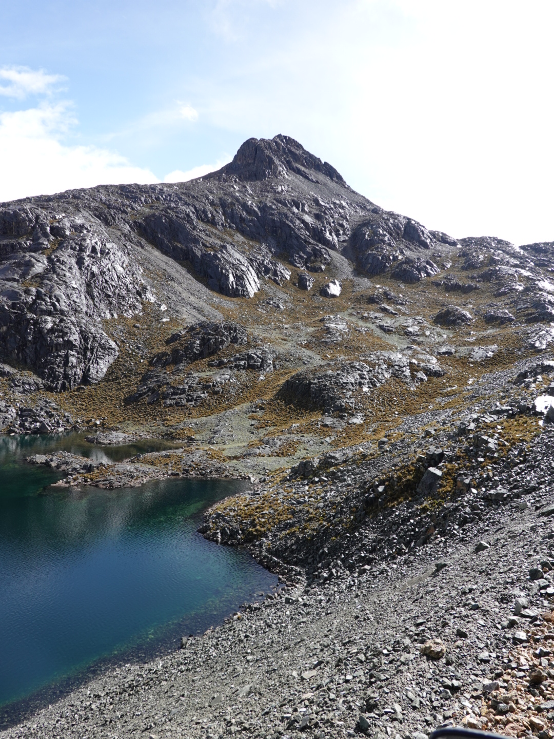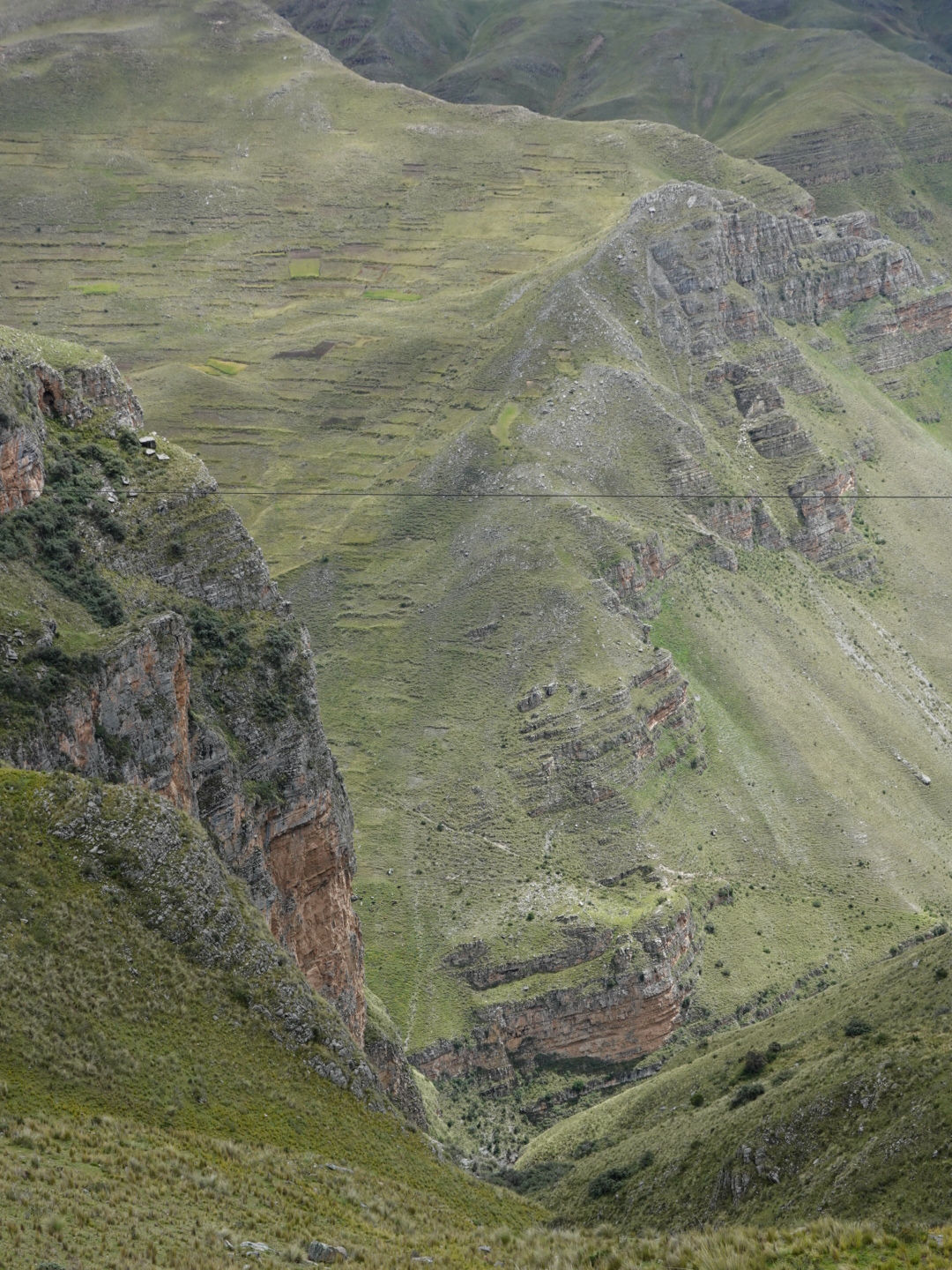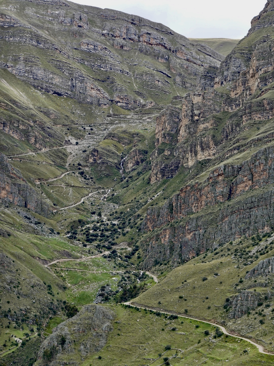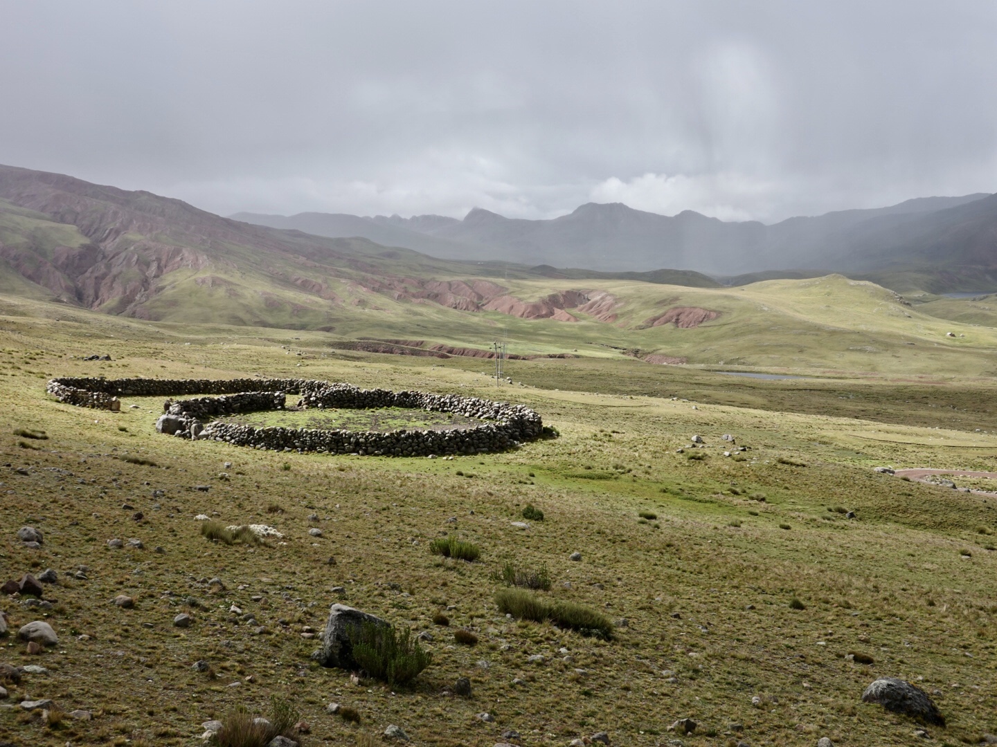 In any case, our plan today was to pick up one of these routes and head north. As seems to be typical to the start of all our days in Peru, we pretty immediately started climbing. This time from 12,400 feet up to over 15,000 feet. As we climbed we found ourselves in a light, but steady rain and, of course as we got higher it got colder. Once we peaked we rode for 30 minutes or so at that level before dropping again. As you’ll see from the photo’s, the landscape was covered with a light coating of snow, which accentuated the scenery. In the ensuing 2 hours we dropped to 12,000 feet and climbed back up to 15,000+ feet twice in succession through a series of rain showers.