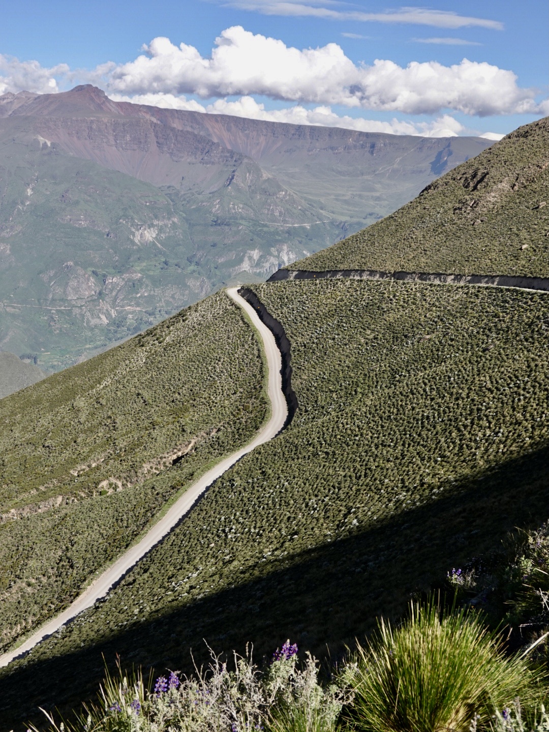 As with the day before, we started out under clear blue skies as we departed Pausa around 9:30 or so. Recall from the day before, our entry to the garage where we parked our bikes was through a construction site and so today our exit was through the same. As we came out to load the bikes, we found that there was a 5 foot trench immediately outside the entrance. Fortunately within 15 minutes a backhoe showed up, quickly filled the trench and we were on on our way. From there we proceeded for the next hour or so due north on a single land paved road through the Rio Huanco Huanca valley and a succession of small villages surrounded by farm fields… Mirmaca, San Juan, San Sebastián de Sacraca, Lampa, Colcabamba, Marcabamba and ultimately Vilcar. At Vilcar we crossed the river and started climbing from 8,000 feet upto 11,000 feet, where we stayed more or less over the course of the next 35km (90 minutes).